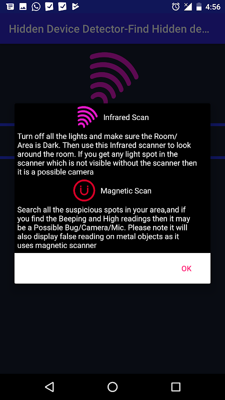 Hidden device detector has 2 major features the magnetic sensor and infrared scanner. The hidden device detection has Magnetic sensor which can detect any EMF radiation emitted from electronic devices and Infrared scanner will scan the room/area without light to look for the infrared cameras by using this hidden camera detection tool. It’s very easy to use help can also be found inside the app. Enjoy this hidden device detection App 🔎
