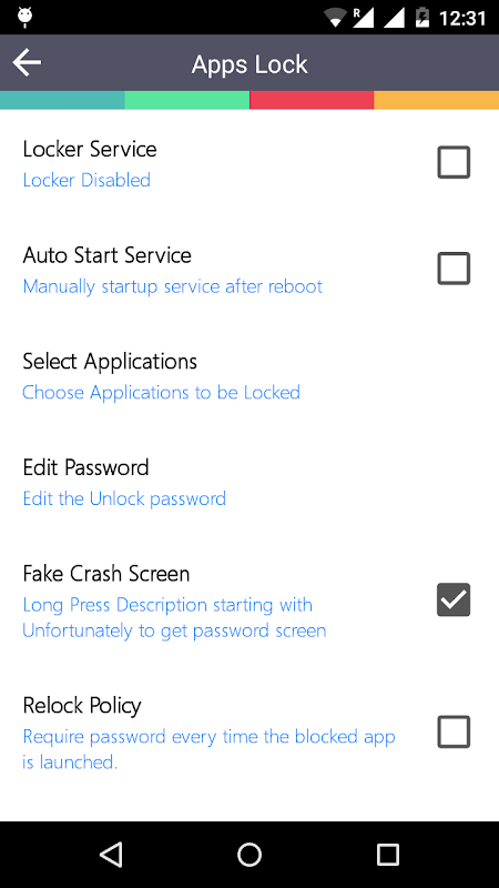 ** FAKE CRASH SCREEN :- Lock applications with fake crash screen. When some one tries to open an application you have locked. It will show a fake crash screen titling "Unfortunately application has been stopped". After Long press this title you will get password screen to enter your private application.