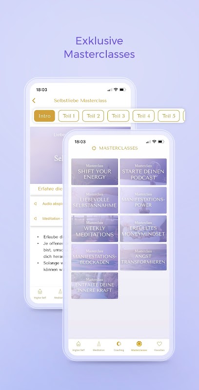 من خلال الاشتراك المتميز ، يمكنك أيضًا الوصول إلى دروس الماجستير بواسطة مدربة الحياة Laura Malina Seiler. هذا متاح فقط في التطبيق! مدخلات رفع المستوى لنفسك الأعلى في شكل مقاطع فيديو وتأملات وأشياء أخرى مثل دروس إتقان حب الذات ودروس رئيسية مكثفة للتأمل لمدة 7 أيام.