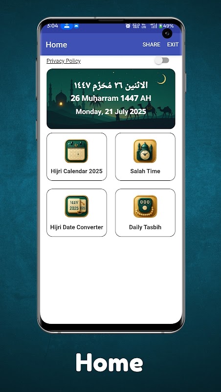 يحتوي التطبيق على التقويم الهجري، مواقيت الصلاة الدقيقة، وعداد تسبيح ذكي — كل ذلك في تصميم سهل الاستخدام وسهل الاستخدام.