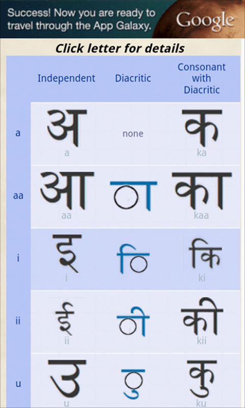 Hindi Alphabet teaches you the history and structure of Devanagari, the Hindi Alphabet , then lets you learn Hindi at your own pace using easy-to-navigate lessons, quizzes, and flashcards.