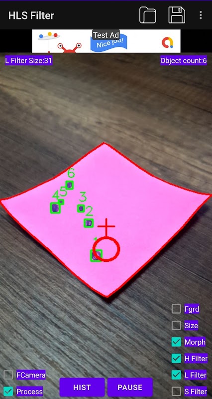 This app can filter camera and file images based on a HLS filter. You can subtract background and foregound objects and save them as a PNG file with a transparent background. Also you can change object colors based on filter values.This app also can count objects based on adjusted settings.
