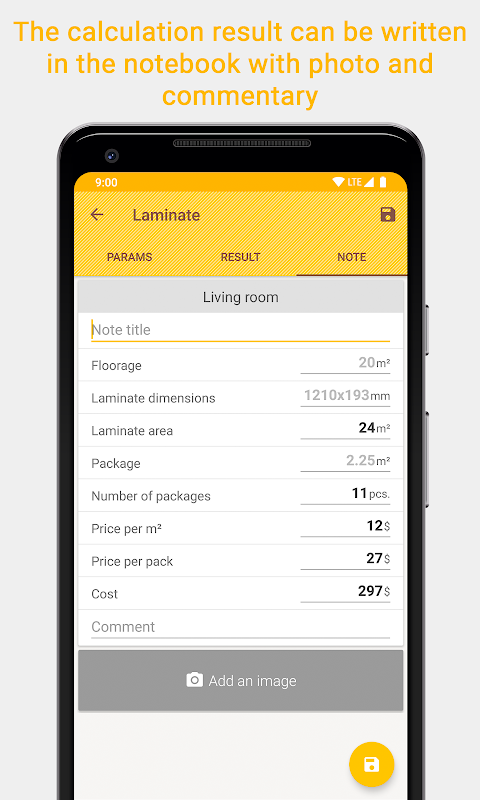 الآن تحتاج فقط إلى معرفة أبعاد الغرفة - سوف HomeRepair تفعل كل الحسابات بالنسبة لك. وستستغرق جميع الحسابات أقل من دقيقة واحدة! يمكن كتابة النتيجة في دفتر الملاحظات مباشرة في البرنامج ، ويمكنك حساب تكلفة المواد على الفور. بهذه الطريقة يمكنك التحكم في ميزانيتك ولن ننسى المواد.