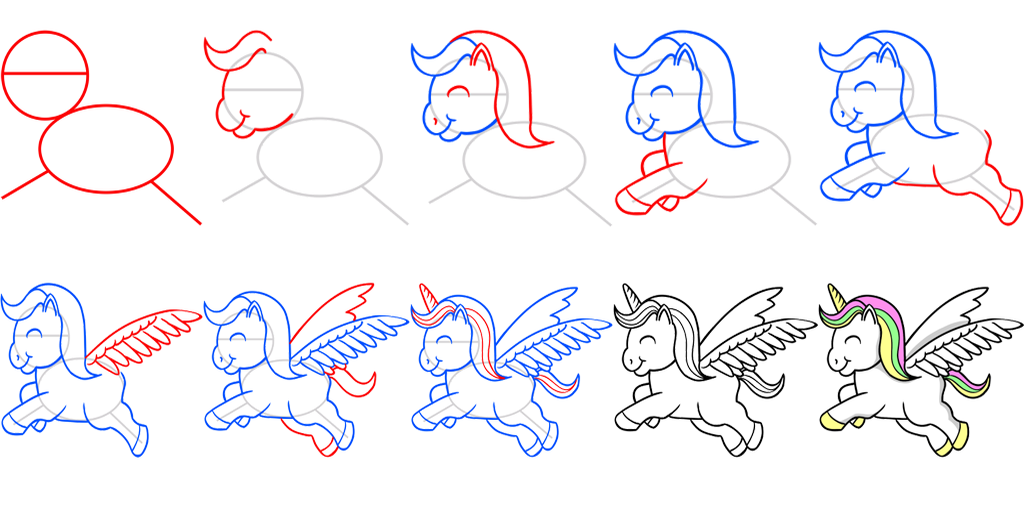 Turtorial drawing of flying unicorns step-by-step in the application How to Draw Unicorns.