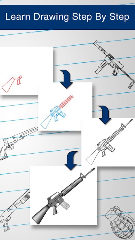 تعلم كيفية رسم الأسلحة هو التطبيق الذي يعلمك كيفية رسمها سلاح الصور خطوة بخطوة.