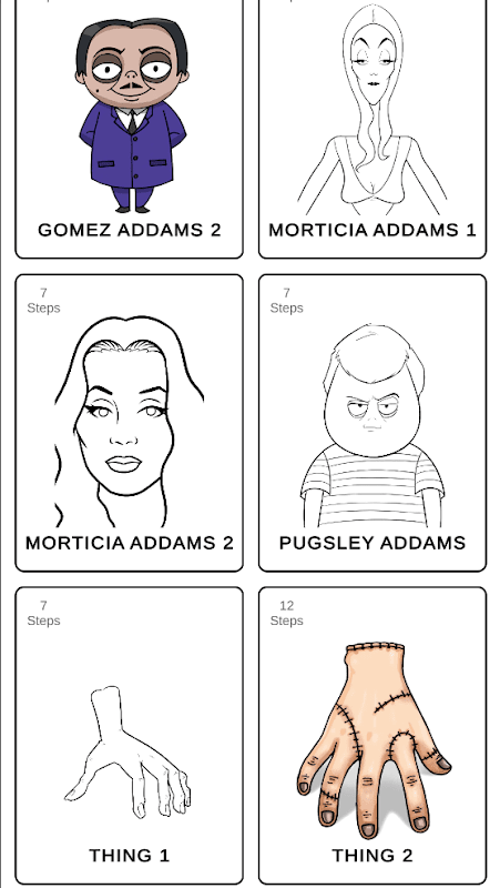 من خلال الرسم باستخدام التطبيق التعليمي How to draw Wednesday Addams ، لا يمكنك الاسترخاء فحسب ، بل يمكنك أيضًا تحسين مهاراتك. يرسم! يشعر وكأنه فنان!
