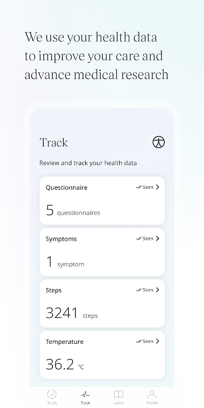 Huma Virtual هو التطبيق المصاحب لصحتك وقد تم تكوينه خصيصًا من أجلك. يتتبع التطبيق صحتك بين مواعيد الطبيب ويشارك معلوماتك الصحية حتى تتمكن أنت وفريق رعايتك من اتخاذ قرارات أفضل. يجب أن يوصي طبيبك بالتطبيق لك حتى تكون مؤهلاً لبدء استخدام التطبيق.