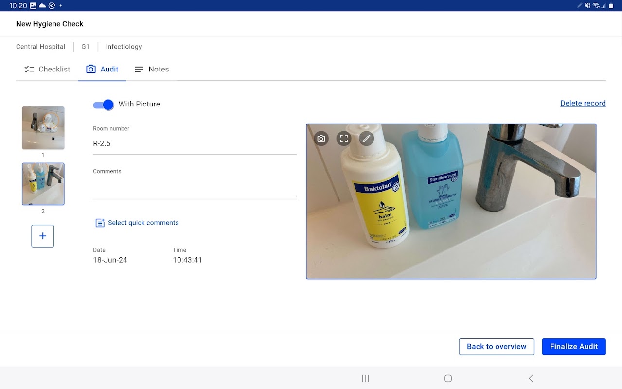 باستخدام Hygiene Check، يمكنك تنفيذ عمليات فحص النظافة الرقمية في الوقت الفعلي بمساعدة قائمة مرجعية متكاملة ووظيفة الصورة لجهازك اللوحي/الهاتف الذكي، وإنشاء تقرير تدقيق بلمسة زر واحدة. يحتوي تقرير التدقيق على علامات على الصور، وحقول لمزيد من التحرير (على سبيل المثال، "الشخص المسؤول"، "يجب التعامل معه...") ويتم فتحه على جهاز الكمبيوتر الخاص بك في برنامج Microsoft Word، للسماح لك بالعمل عليه بسهولة أكبر.