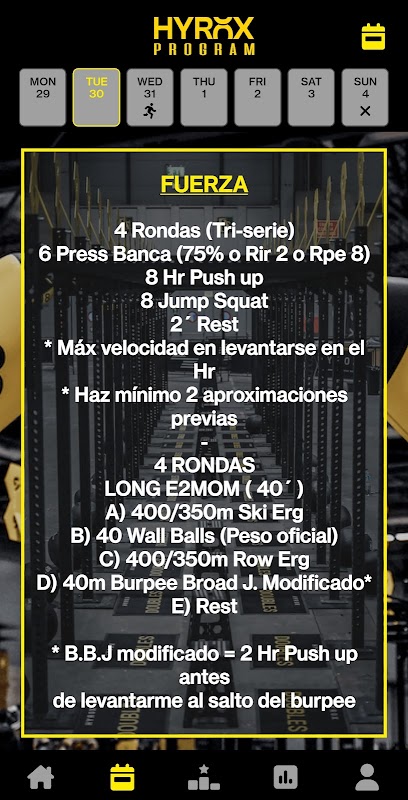 برنامج HYROX هو أول برنامج تدريبي عبر الإنترنت يمكنك من خلاله إعداد منافسيك في HYROX أو ببساطة ممارسة هذا الشكل الجديد من التدريب بجدول أسبوعي.