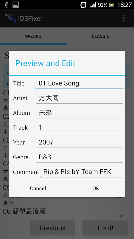 ID3Fixer support multi-select and fix a batch of files. ID3Fixer can read the ID3/WMA/MP4 tags(artist name, album name, song's title, etc..) with the charset you assigned, and you can preview the results before apply to prevent wrong operation.