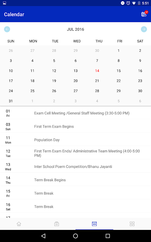 - مدرسة / كلية التقويم للحصول على معلومات عن أيام الأكاديمية والأعياد والاحتفالات، والامتحانات والإجازات وجميع التواريخ الهامة.