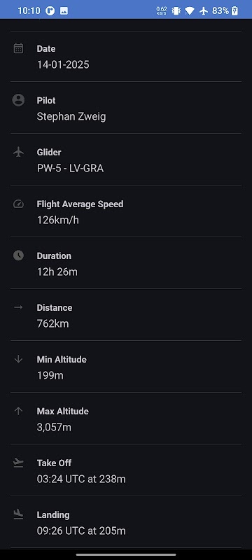 - تنظيم الرحلة: يمكنك بسهولة فرز وإدارة ملفات IGC الخاصة بك حسب الطيار أو الطائرة الشراعية/الطائرة أو التاريخ.