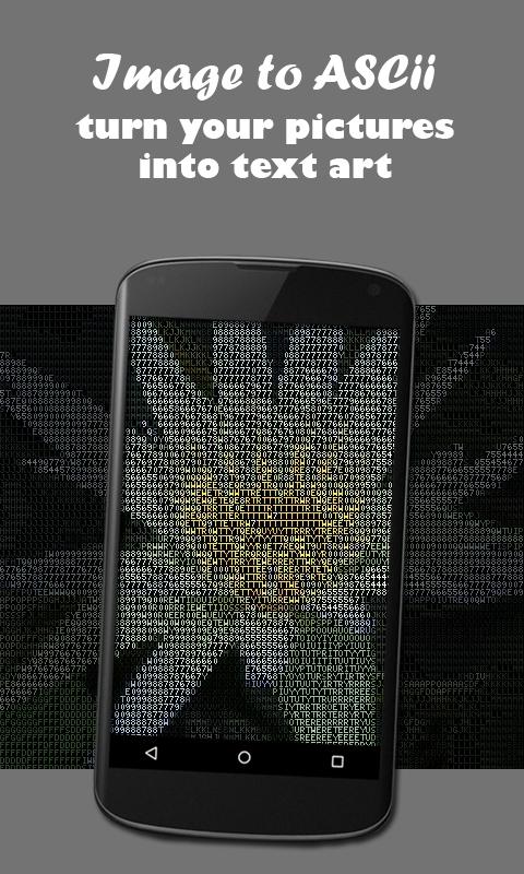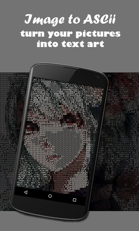 سوف تحصل على نسخة الفن اللون ASCII كامل من الصور الخاصة بك مع هذا التطبيق. صورة لASCII يعمل تماما عند مشاركته في الفيسبوك و Instagram أو على أي مواقع وسائل الاعلام الاجتماعية.
