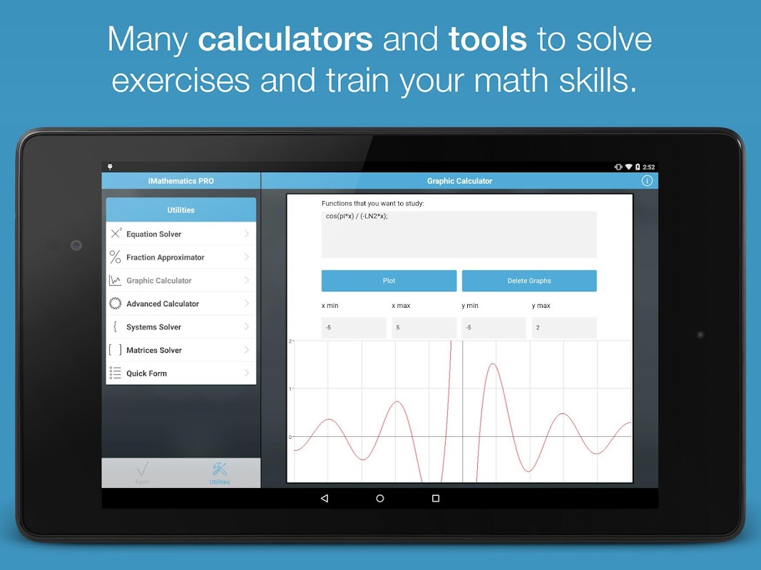 • Get the Advanced Utilities, like the Graphic Calculator, the Systems Solver, the Matrices Solver 3x3 and the Math Glossary.