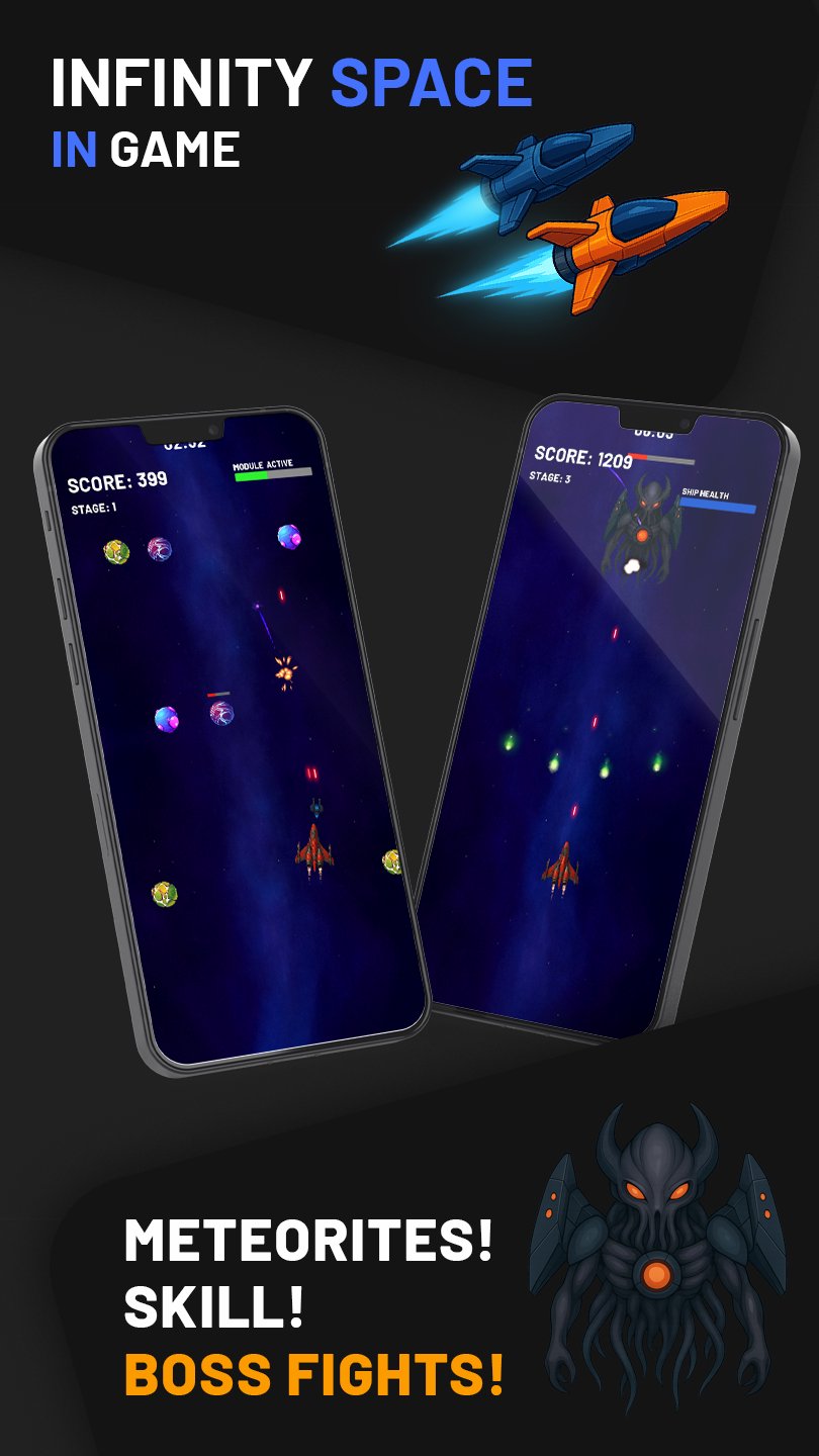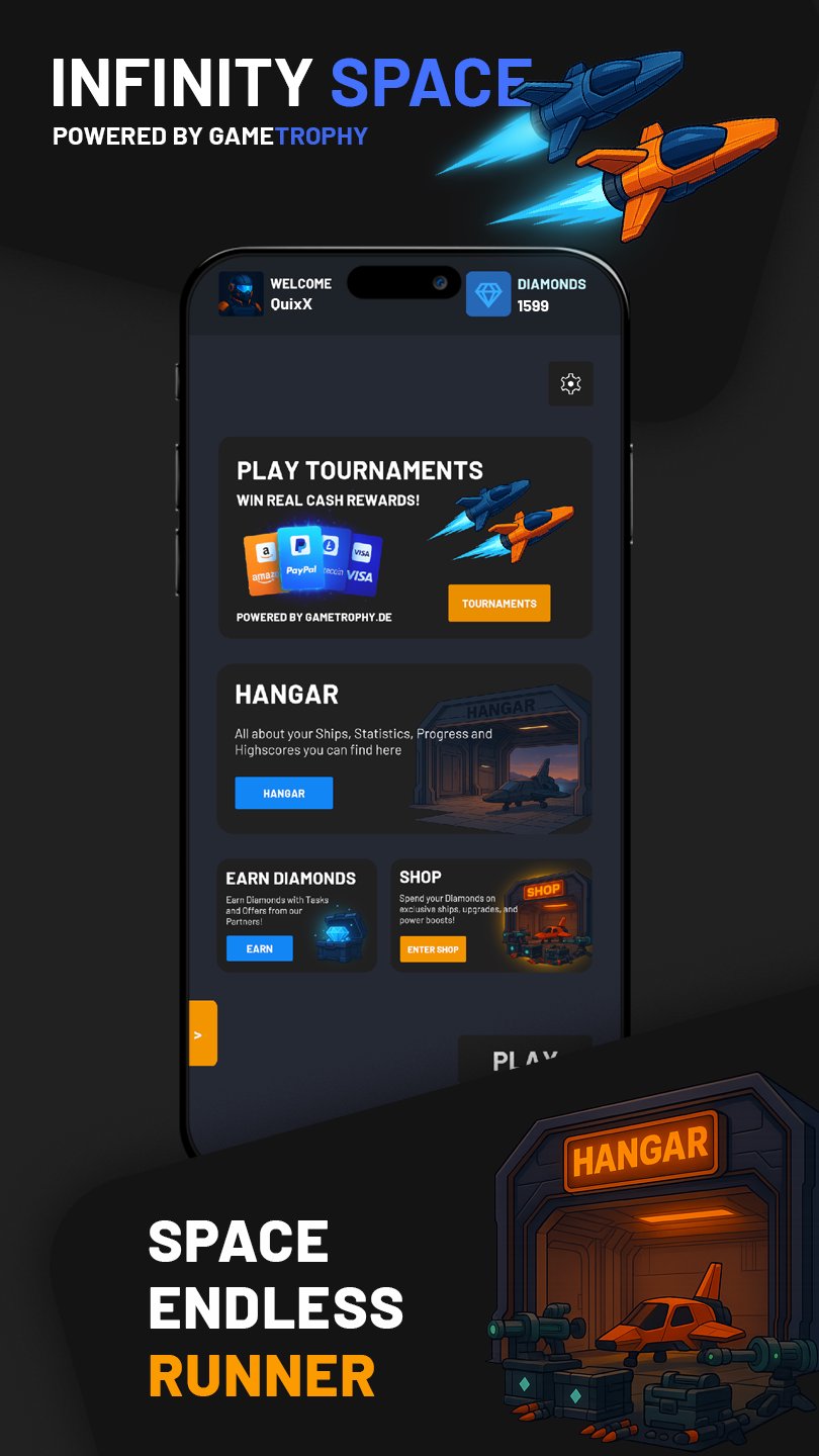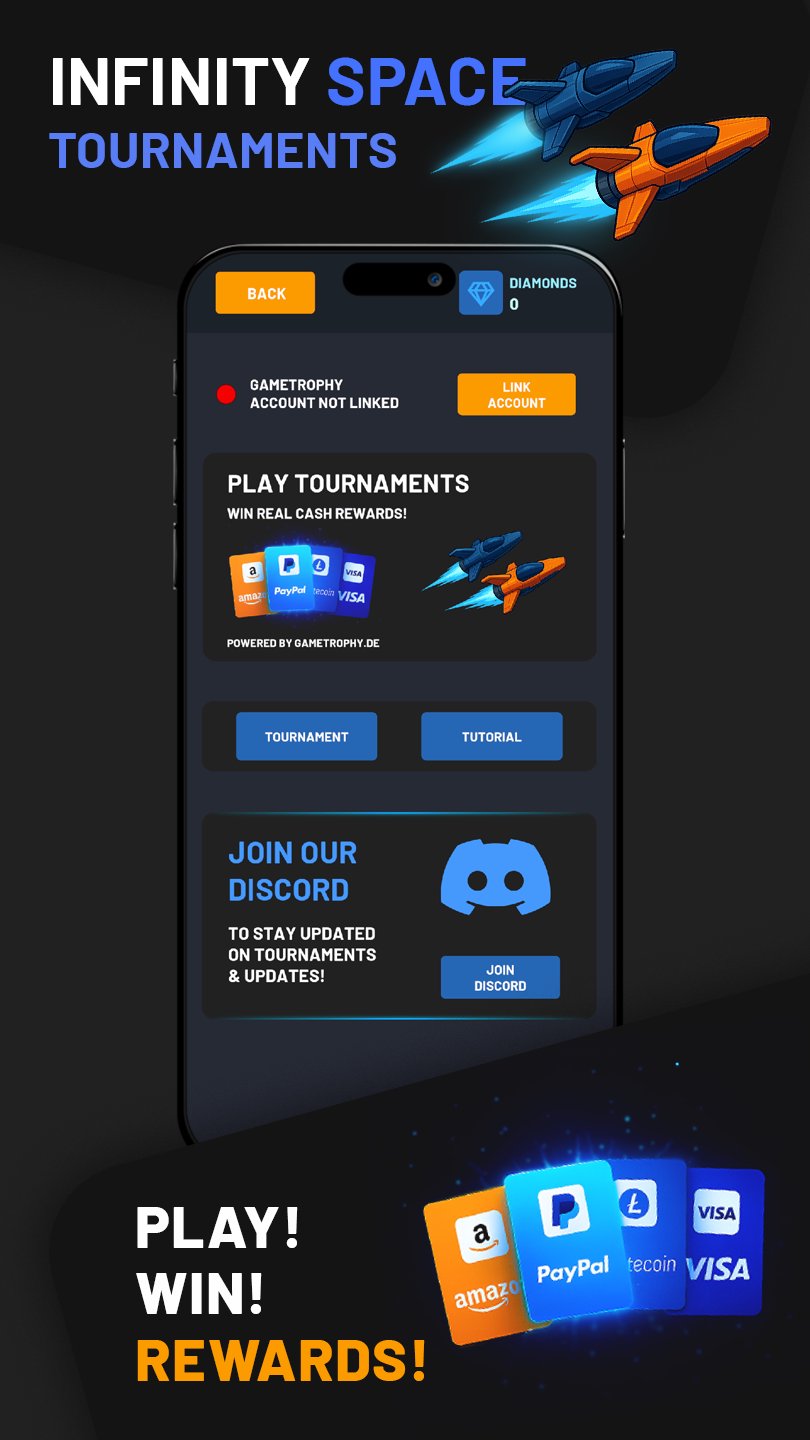 أهلًا بك في فضاء اللانهاية، لعبة العب واربح حيث تتحول المتعة إلى مكافآت حقيقية. قُد سفينتك، وتفادَ النيازك، واجمع النقاط، وشارك في البطولات للفوز بأموال باي بال، والعملات المشفرة، وبطاقات الهدايا من خلال تطبيق GameTrophy.
