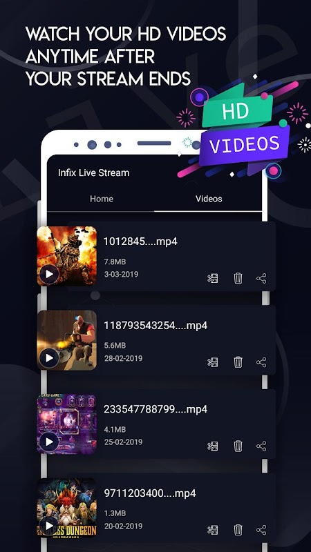 Infix Live Stream is a high quality screen recorder and Live Stream app for gaming and others. Record screen without root. Live Stream your favorite moments while playing games. Infix Live Stream supports all games like PUBG, fortnite, Clash of Clans, Brawl Stars and Others. You can stream on Youtube and facebook aswell. You can show the world how good you and your squad is while live streaming your gaming skills.