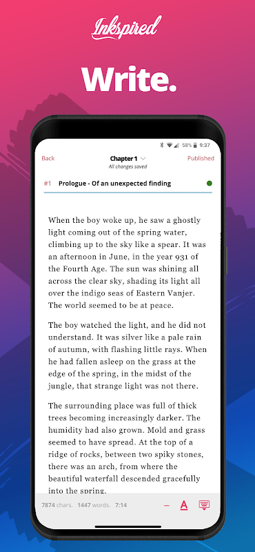 يتيح لك تطبيق Inkspired للأجهزة المحمولة قراءة القصص عبر الإنترنت وغير متصل ، والتواصل مع المؤلفين والمبدعين الناشئين المفضلين لديك ، وكتابة القصص أو الروايات أو الرسوم المصغرة للنشر على نظامنا الأساسي. كل شيء بالمجان!