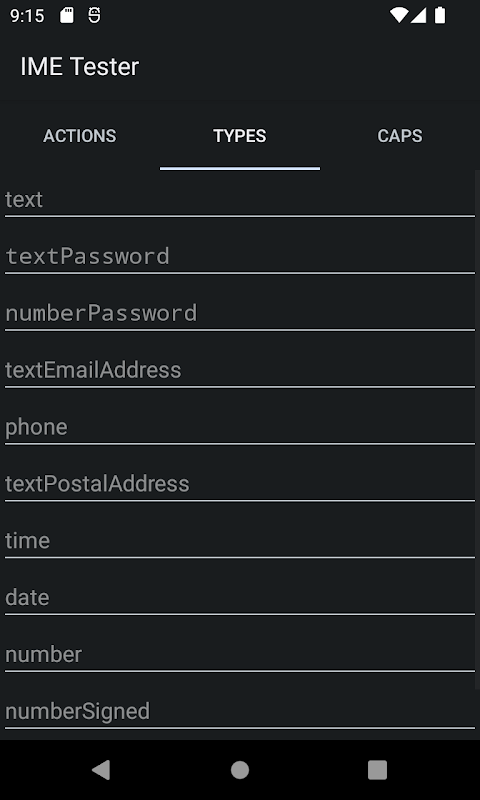 اختبار لوحة المفاتيح الافتراضية باستخدام حقول الإدخال المختلفة