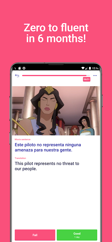 لدينا أيضًا بعض الذكاء الاصطناعي الرائع الذي سيوصي باستمرار بأفضل جملة تالية لتتعلمها. ما هي الجملة التالية الأفضل؟ دائمًا ما تحتوي على كلمة واحدة جديدة مستخدمة بشكل متكرر.