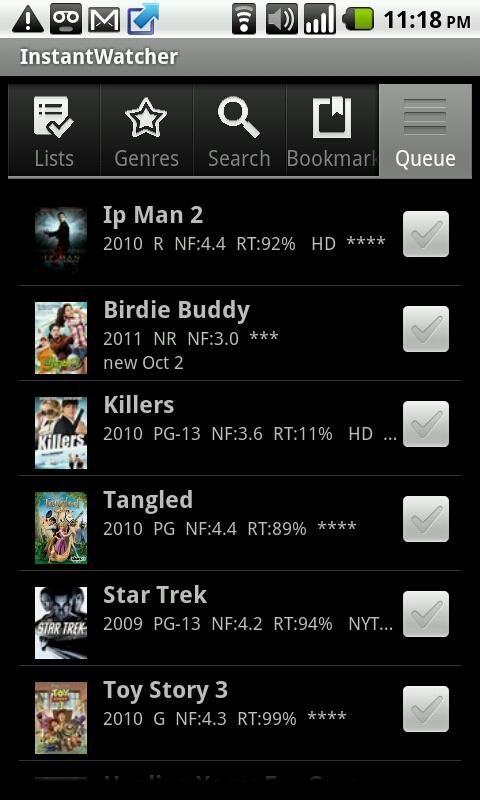 Instantwatcher makes it easy to browse, search, queue, and share on Facebook, Netflix's instant streaming titles from your Android phone. This app also looks for matching YouTube clips and previews for you to watch right inside the application and links instant Netflix titles to movie reviews from The New York Times whenever possible. You can also manage your Netflix instant queue in the application.