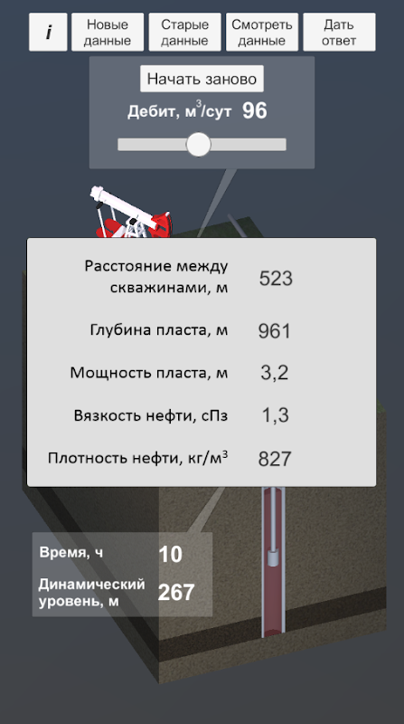 العمل المختبري الافتراضي - دراسة خواص خزان النفط بطريقة الاعتراض الهيدروليكي. يسمح التطبيق للطالب بالحصول على البيانات الأولية للاعتراض الهيدروليكي والتحقق من نتيجة معالجتها.