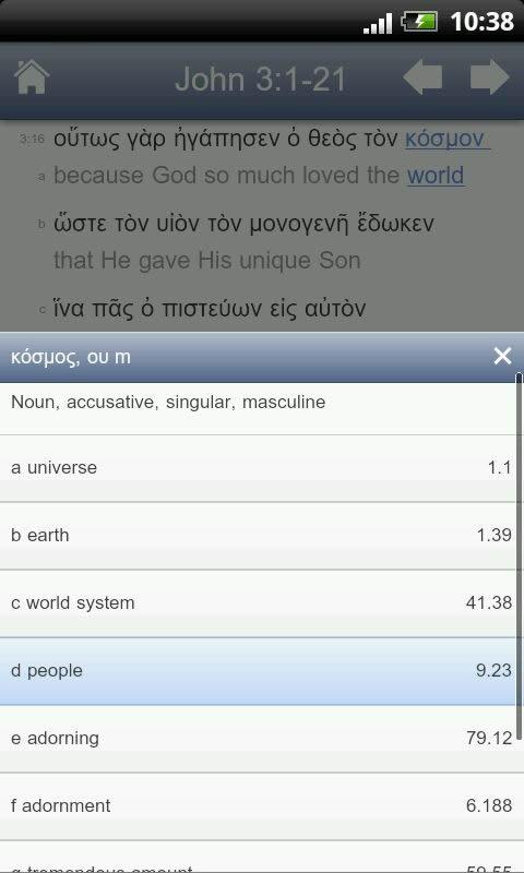 هذا فريدة من نوعها بين السطور يوناني إنجليزي العهد الجديد سهل الاستخدام. بل هو ترجمة بين السطور جديدة مرتبطة النص اليوناني وليس كتابا نشرت في شكل التطبيق. مجرد لمس اليونانية وأنه يعطي الإنجليزية، أو العكس بالعكس. لمس مرة أخرى لمعرفة كل معاني اليونانية ممكن مع واحد الصحيح (ق) في سياق تسليط الضوء عليها. تصفح جميع المعاني. كنت لا بل يجب أن تكون قادرا على قراءة أو نطق اليونانية.
