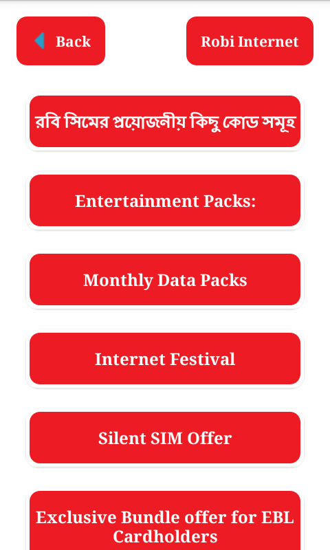 ” Internet package Robi-রবি ইন্টারনেট প্যাক” আমাদের এ এ্যাপস টিতে রবি সিমের সকল নতুন আপডেট বিভিন্ন ইন্টারনেট প্যাকেজ এর তথ্য দিয়ে সাজানো হয়েছে। আপনাদের আর কষ্ট করে দোকানদার দের বলতে হবে না শুধু মাত্র আমাদের এ এ্যাপস আপনার মোবাইল এ থাকলে আপনি নিজে নিজেই বিভিন্ন ইন্টারনেট প্যাকেজ নিতে পারবেন অতি সহজেই । যেভাবে ইন্টারনেট নিবেন , প্র্রথমে কোন প্যাকেজ টি নিবেন তা দেখুন, এবং সে প্যাকেজ টির activation code Dial এর উপর চেপে ধরে কোডটি সিলেট করে তা Copy করে ,আপনার মোবাইলের Keypad এ তা Paste করুন । তাহলে নির্দিষ্ট পরিমান ইন্টারনেট প্যাকেজ টি পেয়ে যাবেন ।