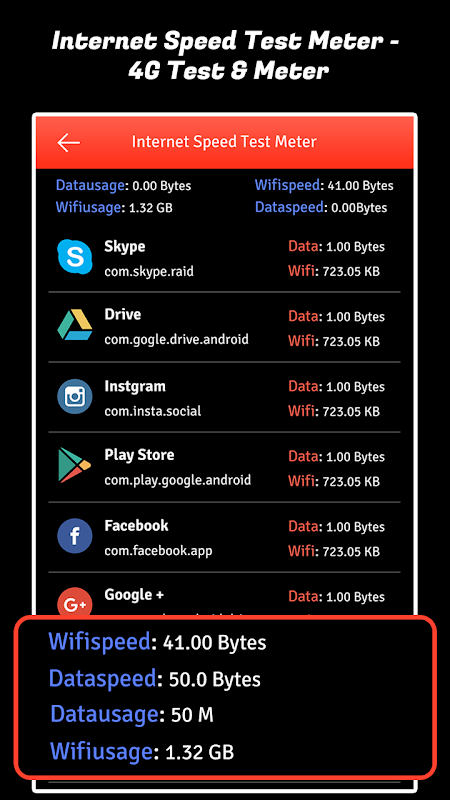 Internet Speed Test Meter - 4G Test & Meter application display internet speed test And Data usage per app. Easy to see History about Data usage with details like date, wifi, data, and total usage. Get everyday perfect Data usage history by our smart application.