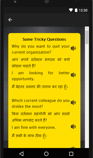 * The app also gives knowledge about tricky questions you can face during an interview in English.