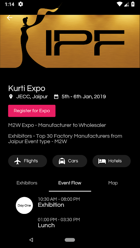 معرض ملابس نسائية التطبيق لتسجيل أولئك الذين يرغبون في حضور المعرض. كما أنه يحتوي على معلومات حول الأحداث القادمة