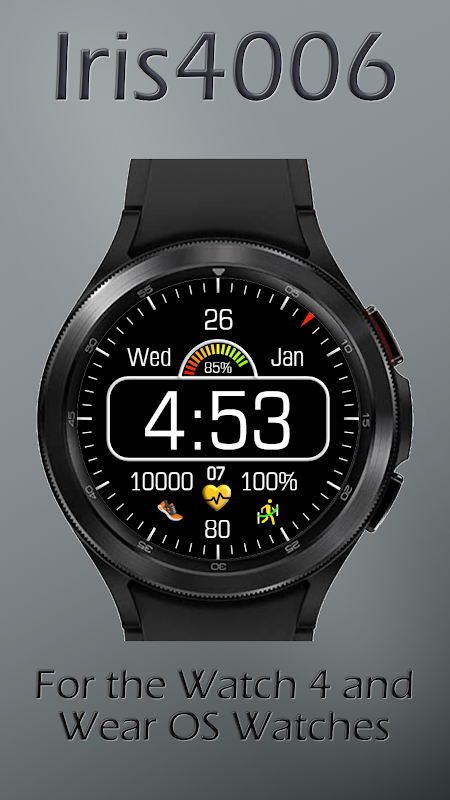 Iris4006 is a digital watch that is and simple and functional with plenty of colorful options. The watch face displays day, date, and month. The time is displayed in either 12 hour or 24 hour format and is automatically set by your smartphone time format setting. Battery percentage, heart rate, step count and step goal percentage are displayed. There are 6 color theme options. Most languages are supported. See feature guide for details.