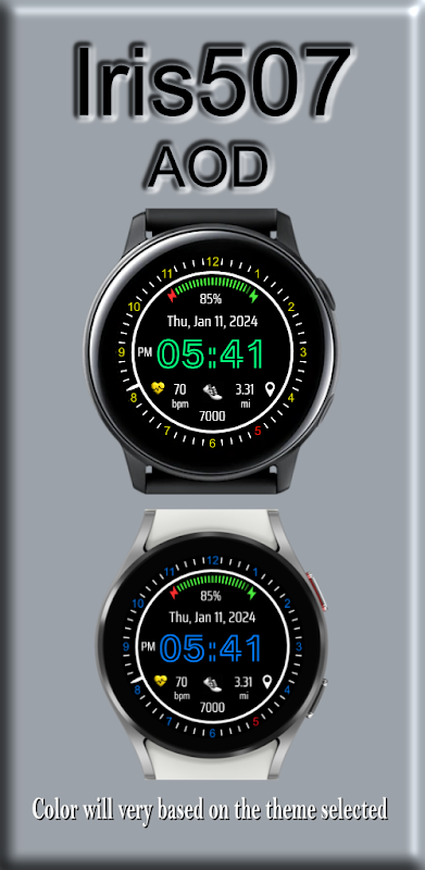 Iris507 هو وجه ساعة رقمي به العديد من الخيارات لتغيير مظهره. إنها بسيطة وعملية مع عرض الكثير من المعلومات المعروضة. يعرض وجه الساعة اليوم والتاريخ والشهر والسنة. يتم عرض الوقت بتنسيق 12 ساعة أو 24 ساعة ويتم ضبطه تلقائيًا من خلال إعداد تنسيق الوقت بهاتفك الذكي. يتم عرض نسبة البطارية ومعدل ضربات القلب وعدد الخطوات. سيتغير رمز معدل ضربات القلب إلى واحد من ثلاثة ألوان بناءً على معدل ضربات القلب لديك. يتم عرض المسافة بالأميال أو الكيلومترات بناءً على إعداد ساعة هاتفك. عند تحديد 12 ساعة، سيتم عرض الأميال، و24 ساعة تعرض الكيلومترات. هناك 9 خيارات ألوان مخصصة للاختيار من بينها للوقت والتاريخ والأرقام التناظرية. يمكن تغيير كل منها بشكل مستقل عن بعضها البعض. هناك أيضًا 6 خلفيات مختلفة و10 مجموعات ألوان ستغير نص البيانات ولون حلقة الدقائق أيضًا. تتيح هذه المجموعات مئات الطرق لتغيير مظهر ساعتك. سيتغير مظهر AOD بناءً على ألوان السمة التي تختارها وسيعرض الحد الأدنى من المعلومات للمساعدة في تحسين عمر البطارية. يتم دعم معظم اللغات. راجع دليل الميزات للحصول على التفاصيل.
