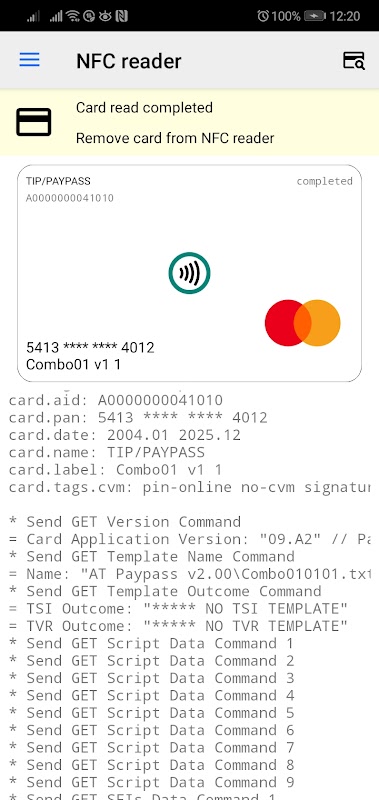 يتم تنفيذ قراءة بيانات البطاقة من خلال تحديد PPSE واختيار AID وGPO وتنفيذ أوامر قراءة السجلات APDU.