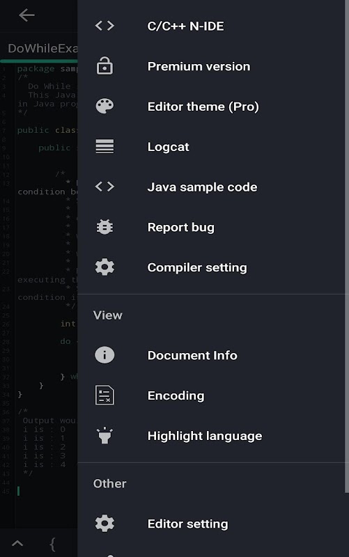 1. Offline java compiler (support jdk 1.5, 1.6. 1.7 or higher if your device support)