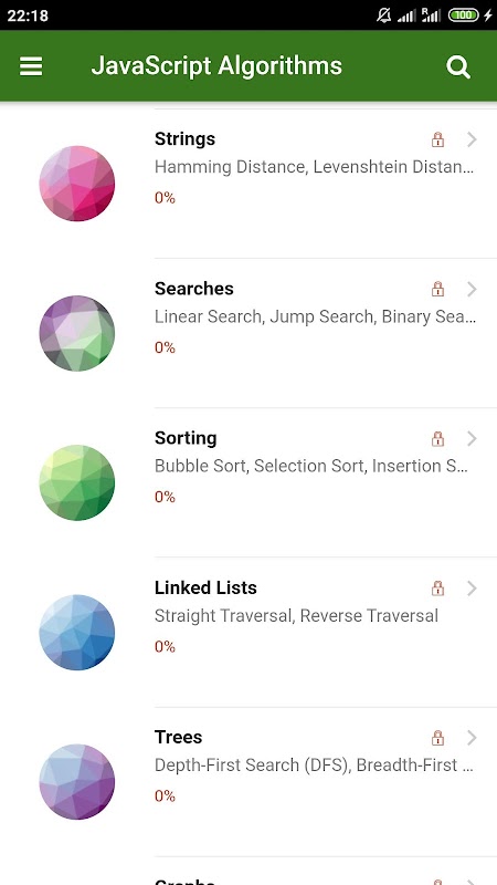يحتوي هذا التطبيق على أمثلة مستندة إلى جافا سكريبت للعديد من الخوارزميات وهياكل البيانات الشائعة.