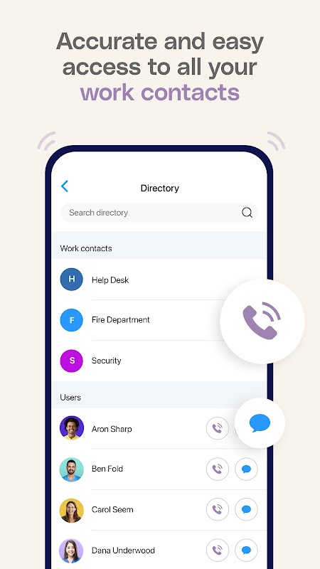 • سجل المكالمات - معرف المتصل للتعرف على المكالمات الواردة من جهات اتصال العمل الخاصة بك