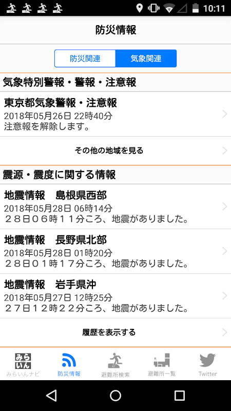 وتحذيرات الاخلاء والتعليمات، وفتح المأوى والمدنية حماية المعلومات (J التنبيه)، ومستوى المياه المعروفة المعلومات النهر، والإعلانات والمعلومات الحدث ومعلومات الطقس، ومعلومات زلزال والمعلومات تسونامي المعلومات تفجر، تحذير اعصار، معلومات الإنذار الكوارث المتعلقة الرواسب، والمحددة في المناطق الحكومية المحلية التي لا تقدم المعلومات إلى معلومات الفيضانات نهر ※ التنبيهات L، يرجى ملاحظة لا يتم عرض هذه المعلومات.