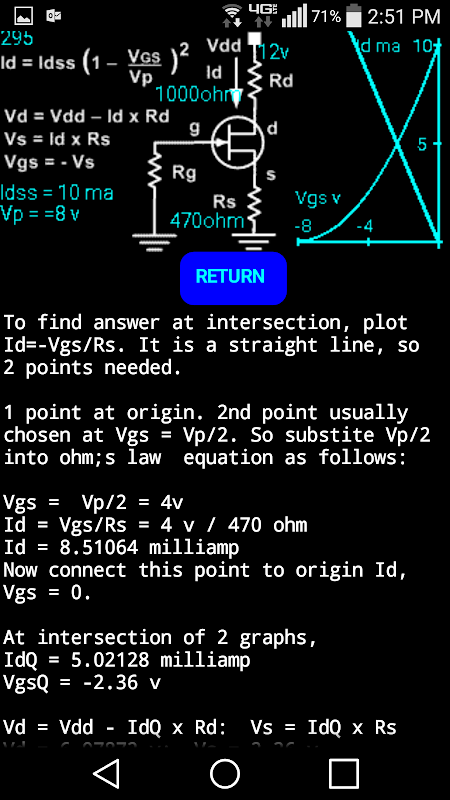 ويوفر هذا التطبيق 2 خيارات لمساعدتك في حل المشاكل JFET التحيز الذاتي. والخيار 1 دليل لكم من خلال حل رسومية للعثور على نقطة التشغيل إذا أعطيت كل القيم الدائرة.