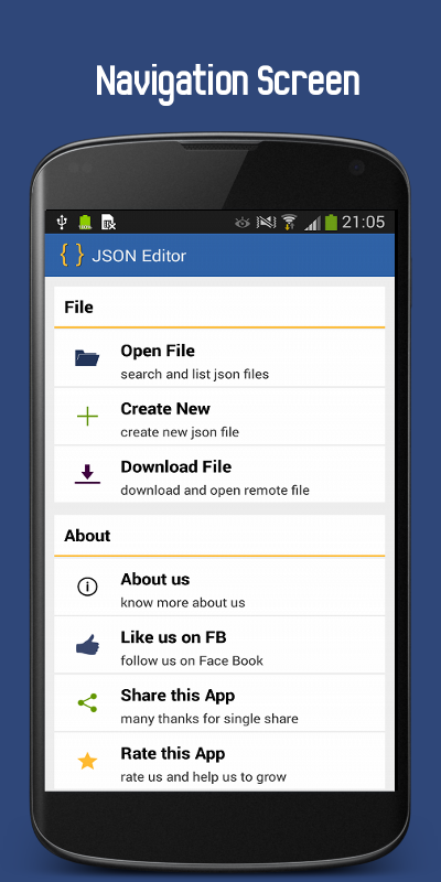 قائمة تطبيق جميع الملفات JSON موجودة على الهاتف. يمكننا استخدام هذا التطبيق لإنشاء وملفات JSON تحرير، تحميل، التحقق من صحة وحصة (النص).