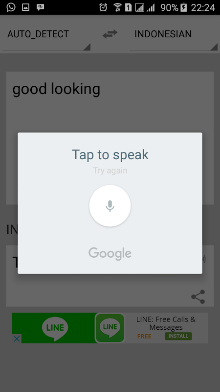 Anda dapat berbagi hasil terjemahan Anda ke media sosial seperti Facebook, Twitter, WhatsApp, Hangouts, messaging, email, Line, WeChat, Kakao Talk, dan aplikasi media sosial lain yang diinstal pada ponsel Anda.
