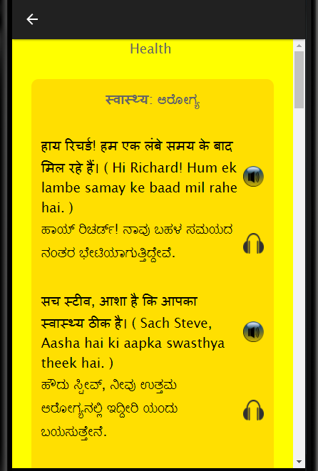 This language learning application can also be used by those Kannada speaking participants who are preparing for BPO, Call Center, Hindi Discussions and Debates as well as Hindi job interview. If you want to learn Hindi grammar, it is advised that you initially go through this application get yourself ready for your next assignment. If I want to learn Hindi, I should be approaching this application for the same and go through all the chapters. This app can help you learn Hindi fast using audio. It is easier to learn the language using Hindi conversation rather than through an Hindi Dictionary. Learning Spoken Hindi had never been easier. Exercises, vocabulary and business Hindi make this application a very special one.