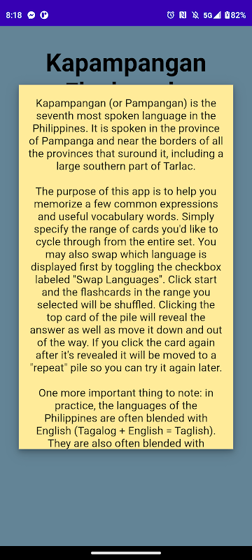 يهدف هذا التطبيق إلى مساعدتك على حفظ بعض التعبيرات الشائعة والمفردات المفيدة في لغة كابامبانغان، المعروفة أيضًا باسم بامبانغان. لاستخدام التطبيق، ما عليك سوى تحديد نطاق البطاقات التي ترغب في التنقل بينها من المجموعة بأكملها. يمكنك أيضًا تبديل اللغة المعروضة أولًا بتفعيل مربع الاختيار "تبديل اللغات". انقر على "ابدأ" وسيتم خلط البطاقات التعليمية ضمن النطاق الذي حددته. سيؤدي النقر على البطاقة العلوية من الكومة إلى كشف الإجابة ونقلها إلى أسفل. إذا نقرت على البطاقة مرة أخرى بعد كشفها، فسيتم نقلها إلى كومة "التكرار" لتتمكن من تجربتها لاحقًا.