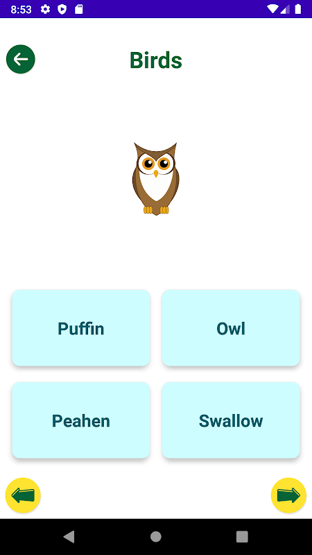 فئات مختلفة مدرجة في التطبيق مثل الحروف الهجائية والأرقام والفواكه والخضروات والحيوانات والألوان والأشكال والزهور والطيور والغذاء والبلد والأشهر وأجزاء الجسم والرياضة ومواد المنزل واسم الوظائف وغيرها الكثير. لتحسين قدرة الاستماع للأطفال واختبار مدرج أيضًا.