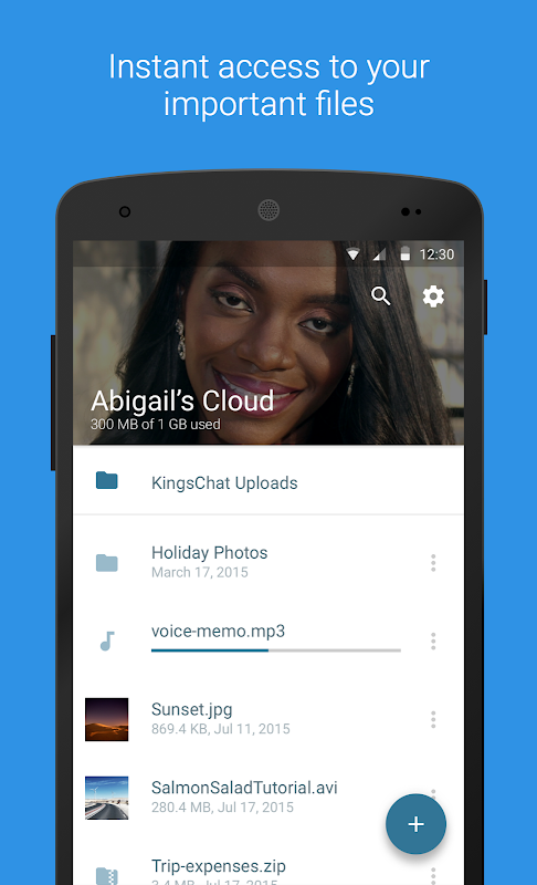 * يوفر مجلد سحابة الشخصية حيث يمكن للمستخدمين تخزين وتنظيم والوصول إلى الملفات الخاصة بهم. مستخدمين تسجيل الدخول عبر حساب KingsChat ويتلقى 1 GB سعة التخزين المجانية!