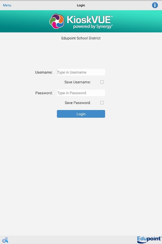 - يستخدم KioskVUE ™ نفس معلومات تسجيل دخول المستخدم مثل نظام معلومات الطالب Synergy ™. يرجى الاتصال بمكتب إدارة منطقة المدرسة للتحقق من إصدار نظام معلومات الطالب Synergy ™ ومعلومات الوصول إلى KioskVUE ™.
