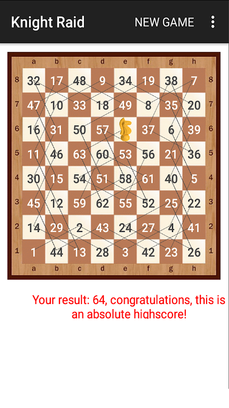 في البداية، تكون الرقعة فارغة. انقر أولاً على الرقعة لوضع الحصان في حقل البداية، ثم انقله من هناك إلى الحقل المطلوب التالي (أو انقر عليه). حاول القيام بأكبر عدد ممكن من الحركات. تُخزَّن أعلى الدرجات الفردية (يمكن إعادة ضبط التخزين من القائمة). الرقم القياسي المطلق، كما قد تتخيل، هو 64.