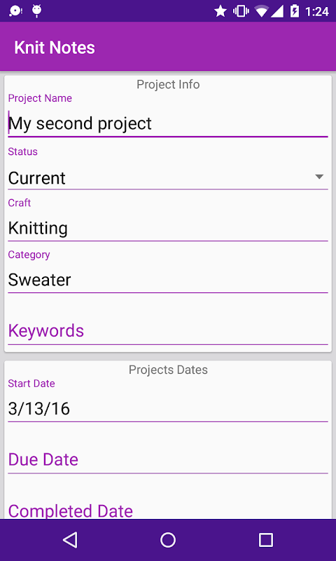Track your knitting or crochet projects here, including storing your project name, status, craft (knitting, crochet, loom knitting), category, keywords, dates (start, due, completed), project notes, and linked crochet hooks and knitting needles.