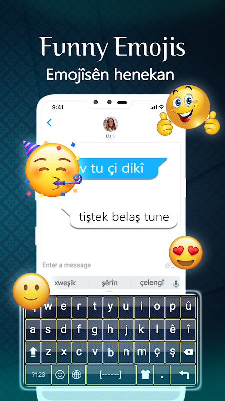 لوحة المفاتيح الكردية - تم تصميم لوحة المفاتيح الكردية باستخدام لوحة مفاتيح باللغة الإنجليزية وهذا هو السبب في أنك لست بحاجة إلى تثبيت لوحتين منفصلتين للغة ويمكنك تجربة تطبيق لوحة المفاتيح النصية الكردية لكتابة كل النصوص الكردية والنص الإنجليزي في تطبيق واحد. لوحة المفاتيح الكردية - لوحة المفاتيح الكردية هي ببساطة تطبيق لوحة مفاتيح مصمم برموز تعبيرية أنيقة مبتسمة يمكنك استخدامها وفقًا لوضعك. على سبيل المثال ، يمكنك استخدام رموز تعبيرية سعيدة عندما تكون في وضع السعادة. هذه الرموز التعبيرية قادرة على التعبير عن مشاعرك بشكل أكثر دقة من الكلمات لأن الصورة قادرة على شرح مشاعرك بشكل أكثر وضوحًا. لوحة المفاتيح الكردية - لوحة المفاتيح الكردية مصممة بخيار سهل للتبديل من الكردية إلى لوحة المفاتيح الإنجليزية ثم التبديل مرة أخرى من الإنجليزية إلى لوحة المفاتيح الكردية.