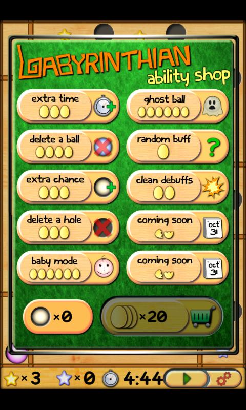 Lord of the Labyrinthian. Explore the Labyrinthian avoid the holes, jump over them and accomplish the missions. Collect stars and hidden bonuses. Reduce your time for completion of levels. Get more points and earn more eggs to be able to use bonuses such as ghost ball, delete ball, delete holes etc. Prove your ability in using accelerometer!