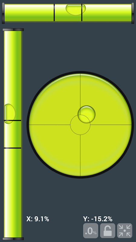 - مستوى الروح منتظم (مستوى فقاعة، libella) - يعمل مثل أداة التقليدية مستوى فقاعة، ضع الهاتف الذكي أو الجهاز اللوحي، على السطح أو على الكائن المراد قياسها أو مجموعة في أي زاوية،